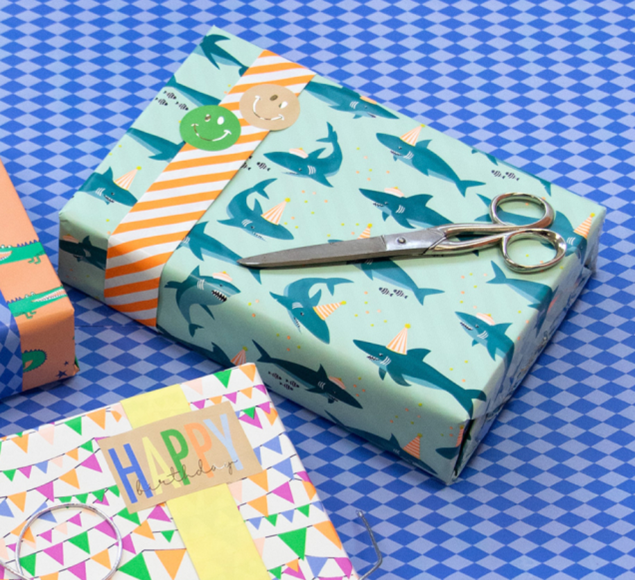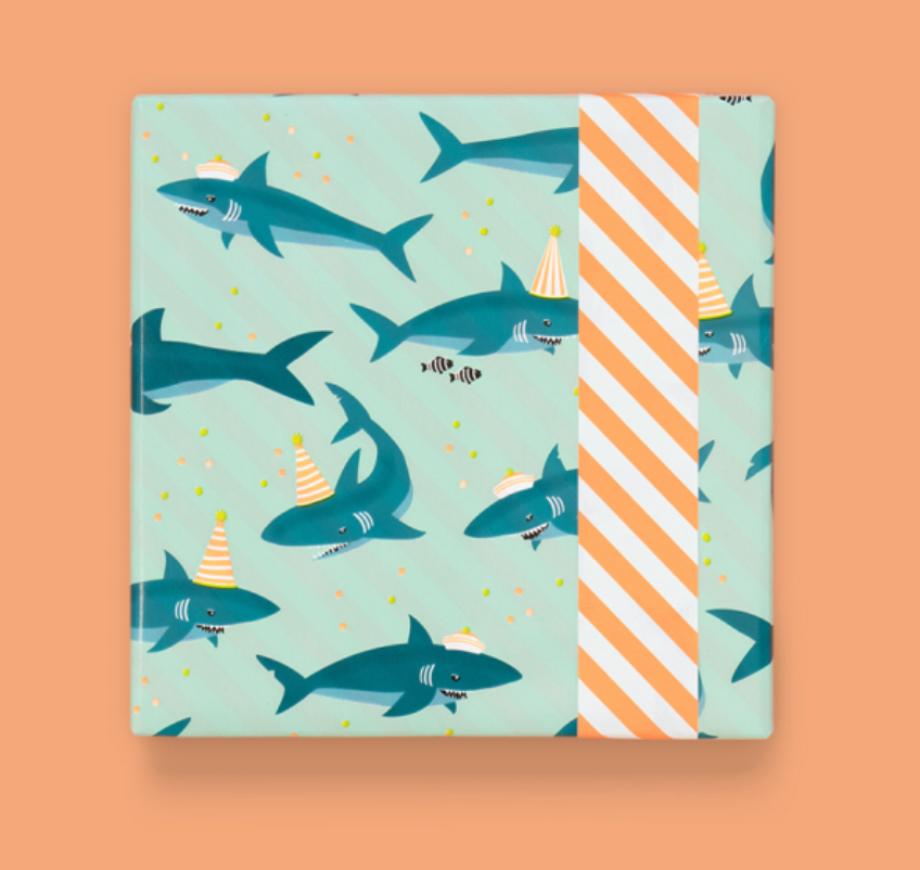 Hochwertiges Einpackpapier mit stylishem Happy Birthday Sharks print.