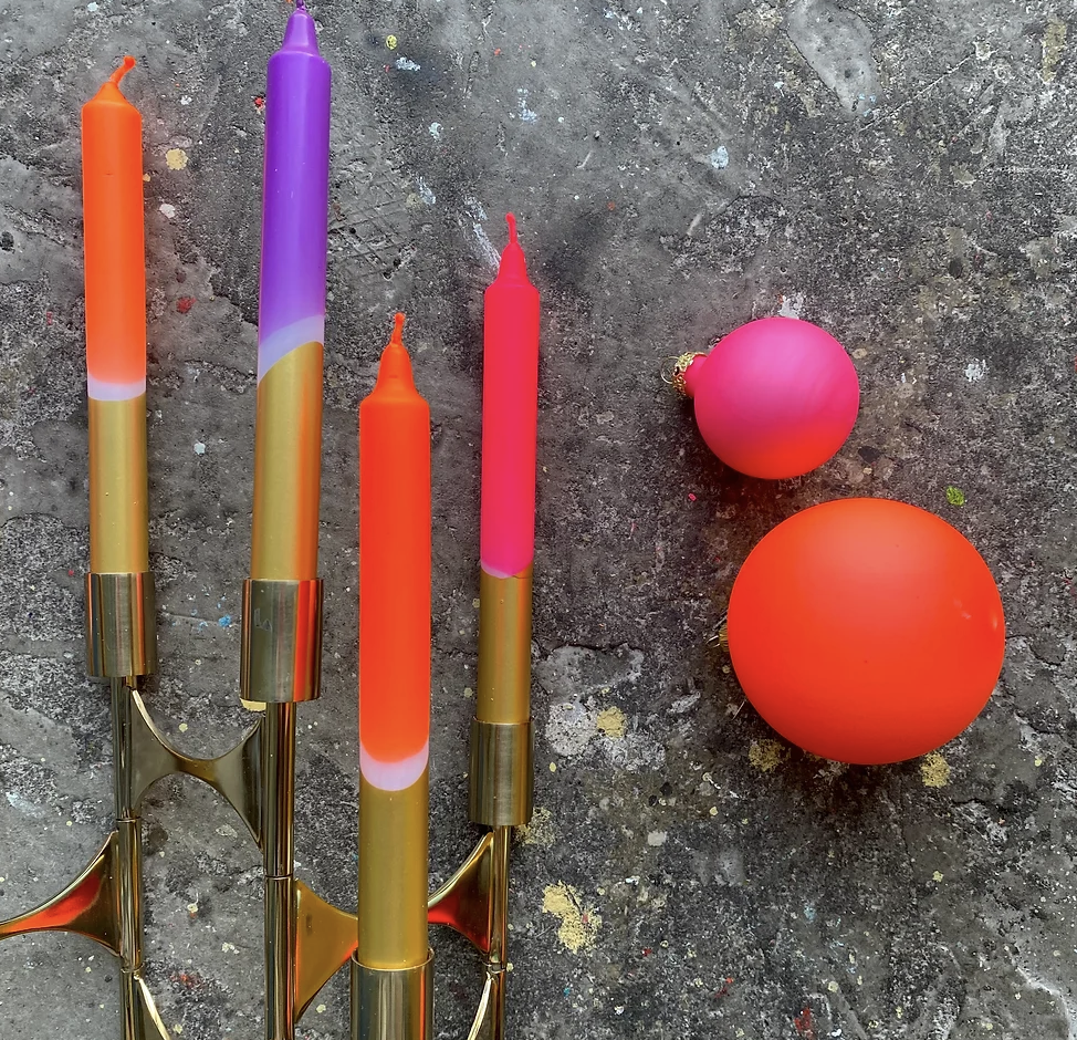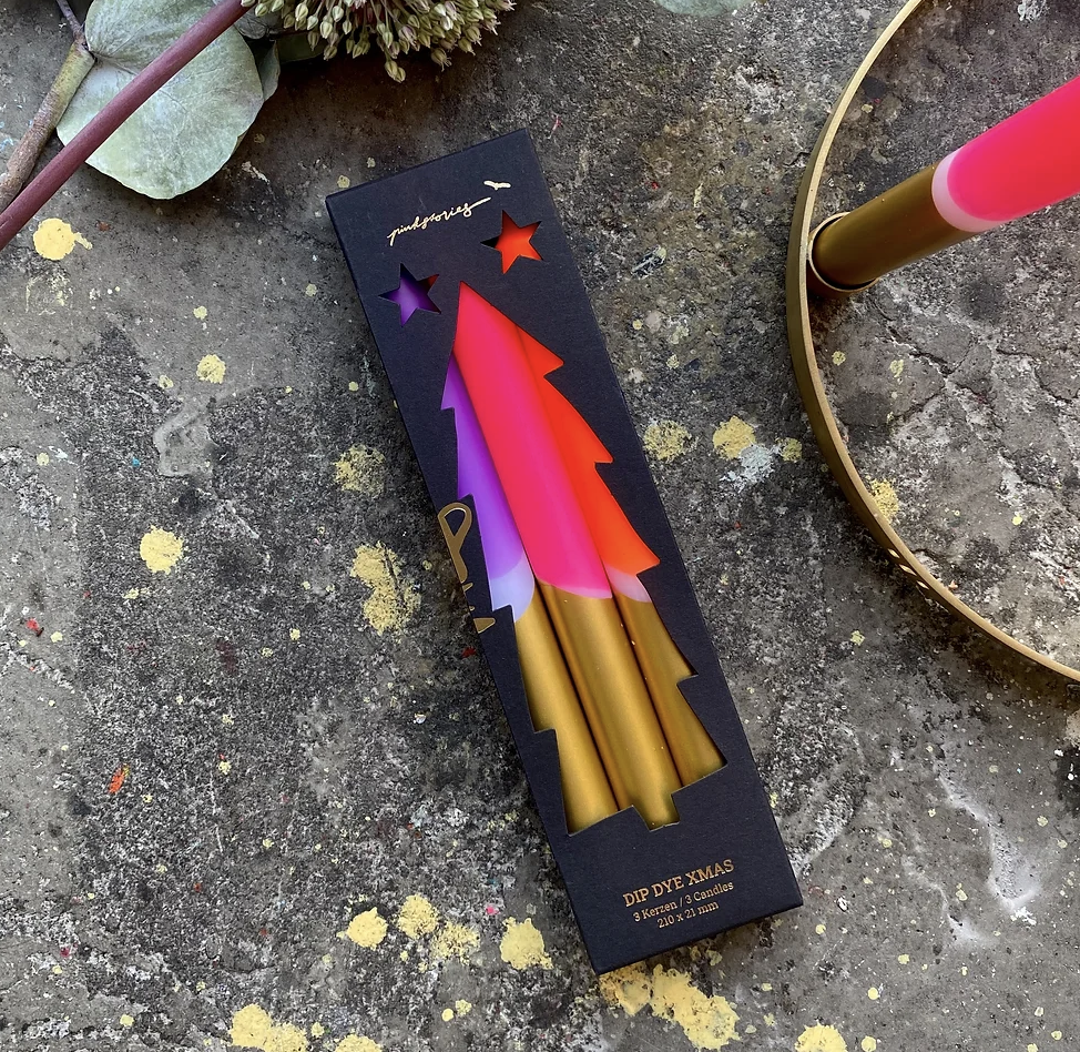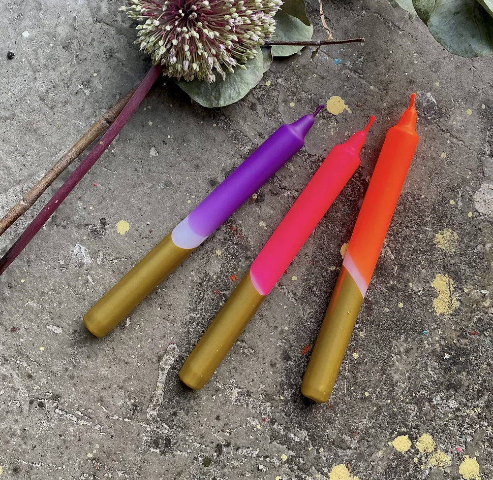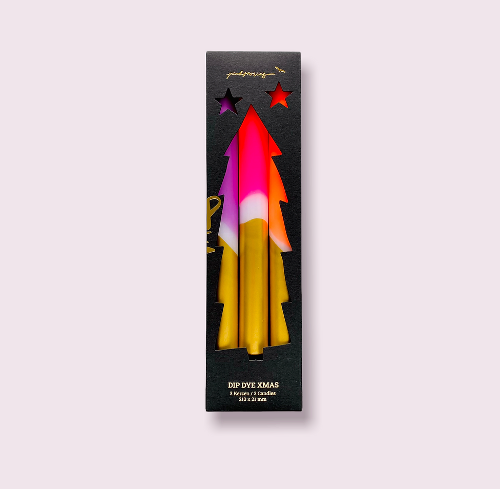 Set of three lovingly hand-colored stick candles in a gold look. The colors remain the same, the pattern gradients vary for each candle, making them particularly unique.