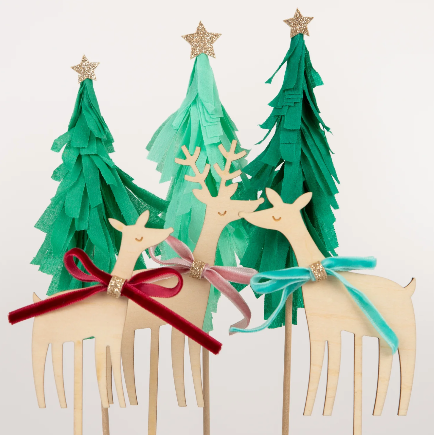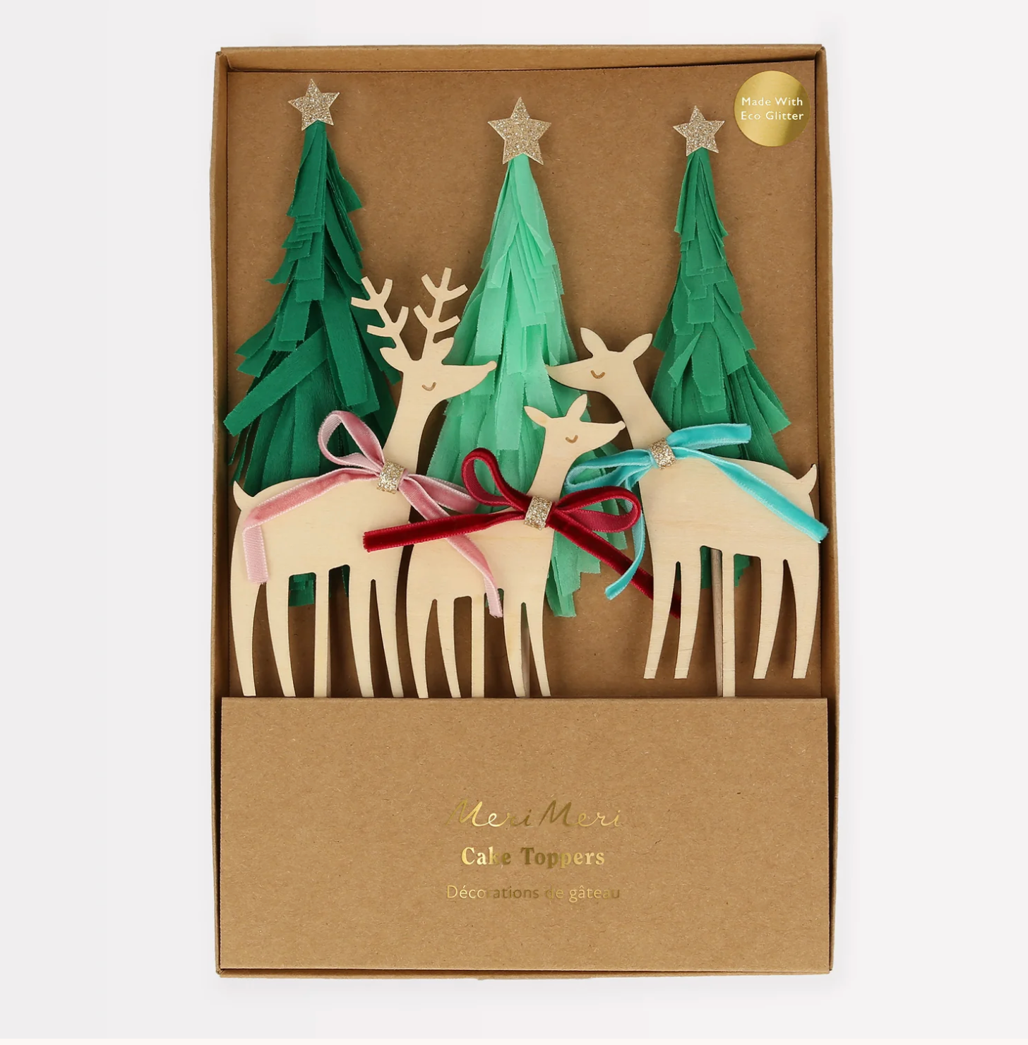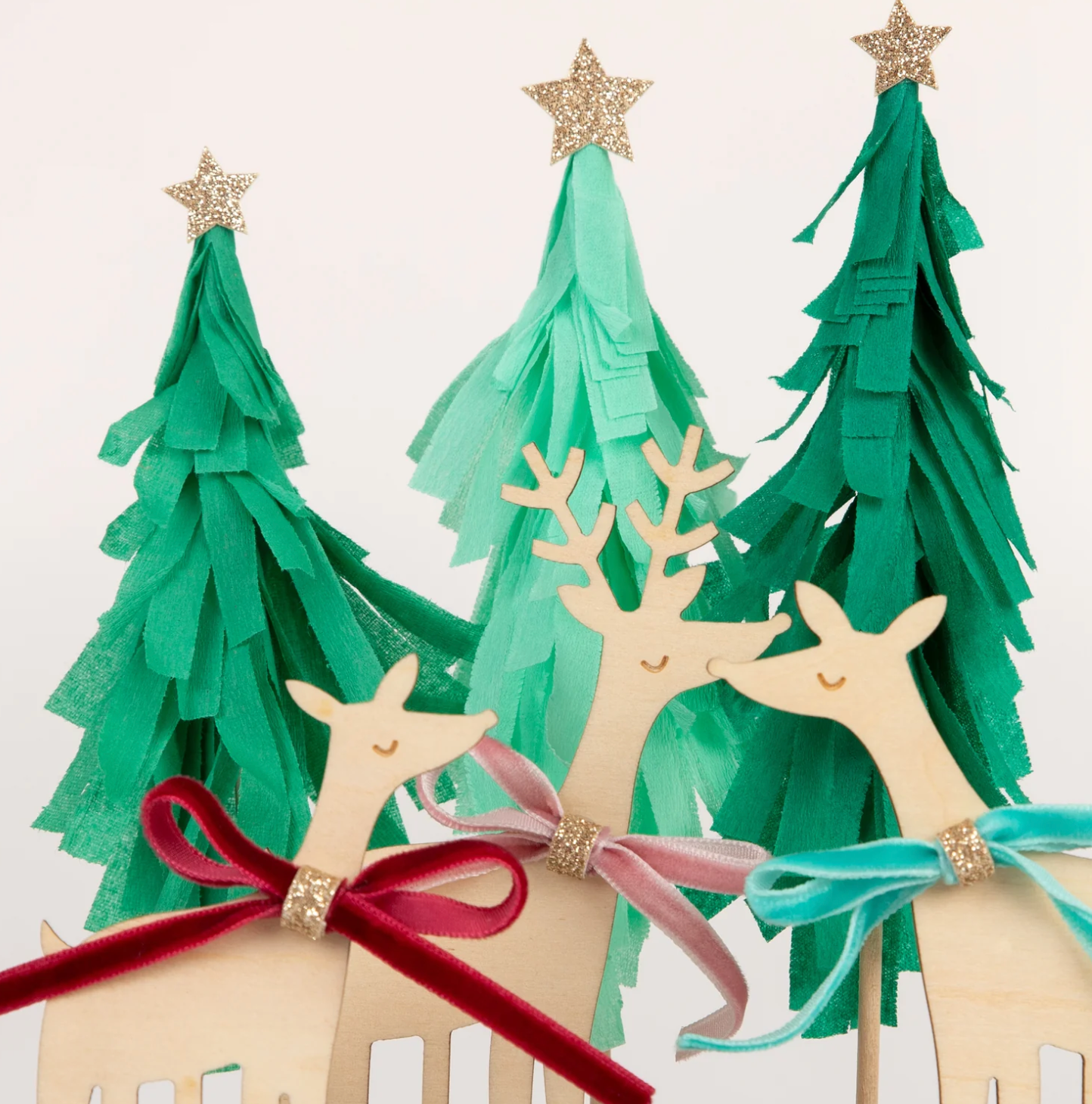 Why have a simple Christmas cake when you can create a winter wonderland in minutes? Our super cute reindeer set from Holt with velvet bows, crepe paper trees and shimmering eco glitter stars will make any cake look professionally perfect. A great gift and can be used again and again.